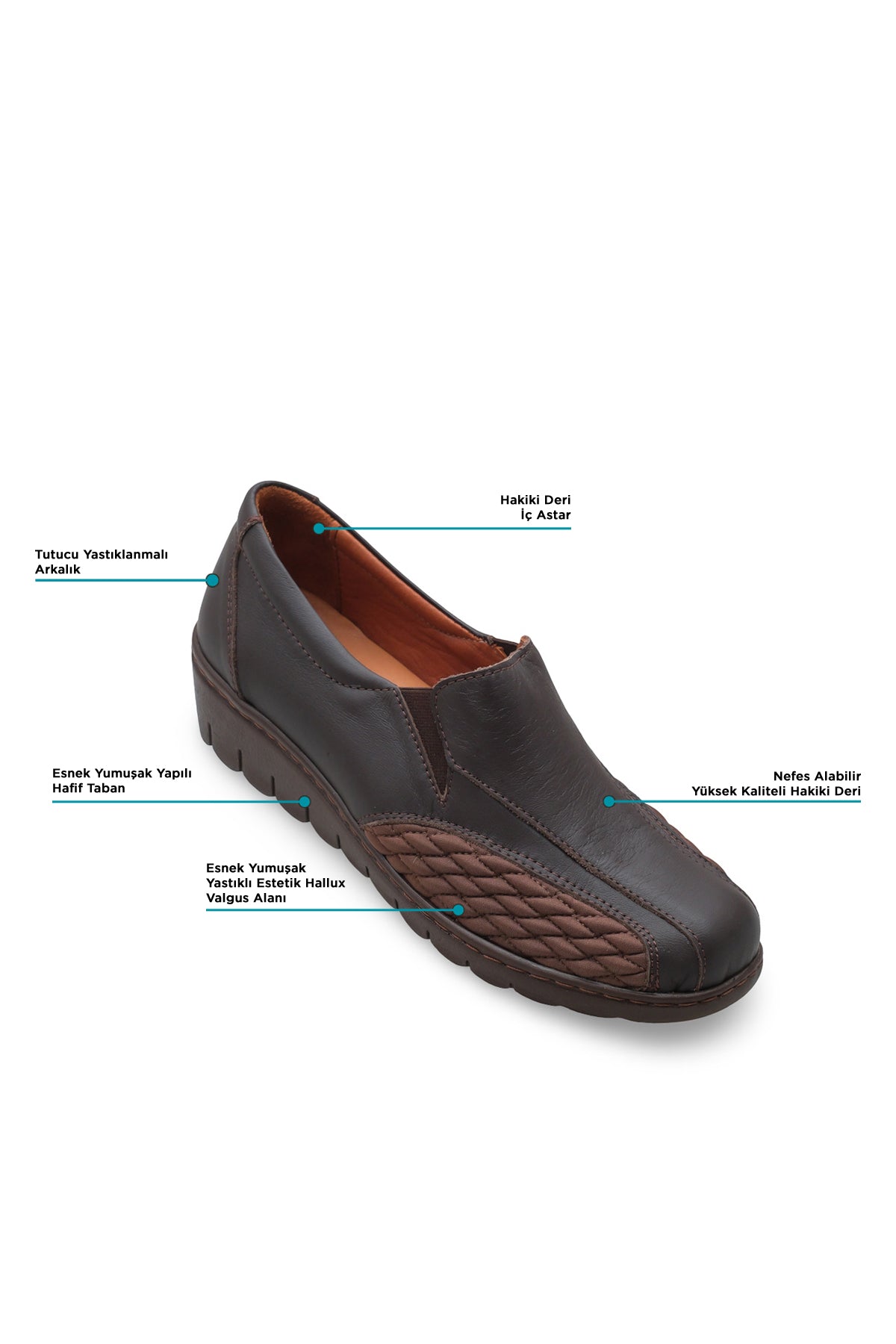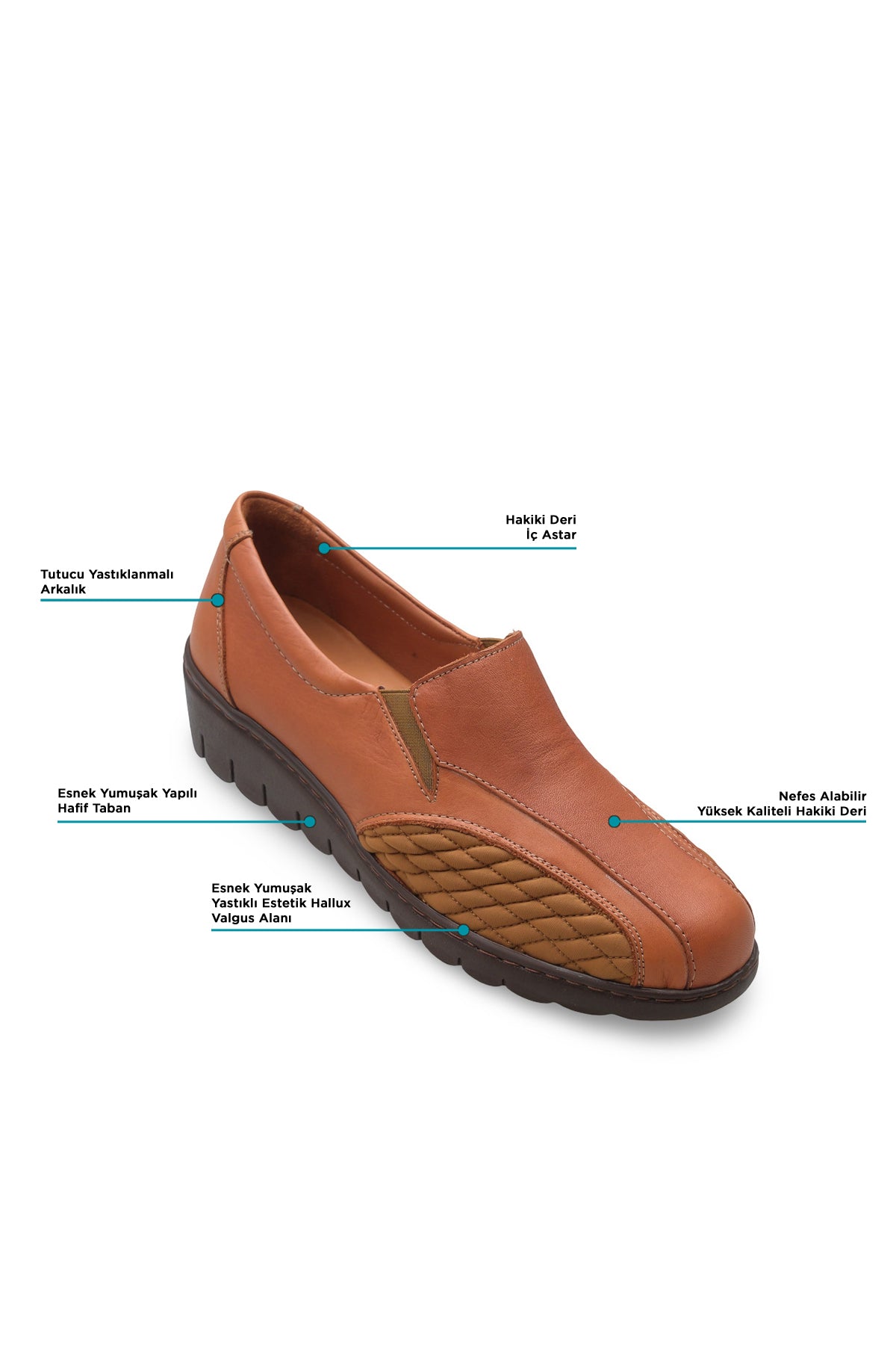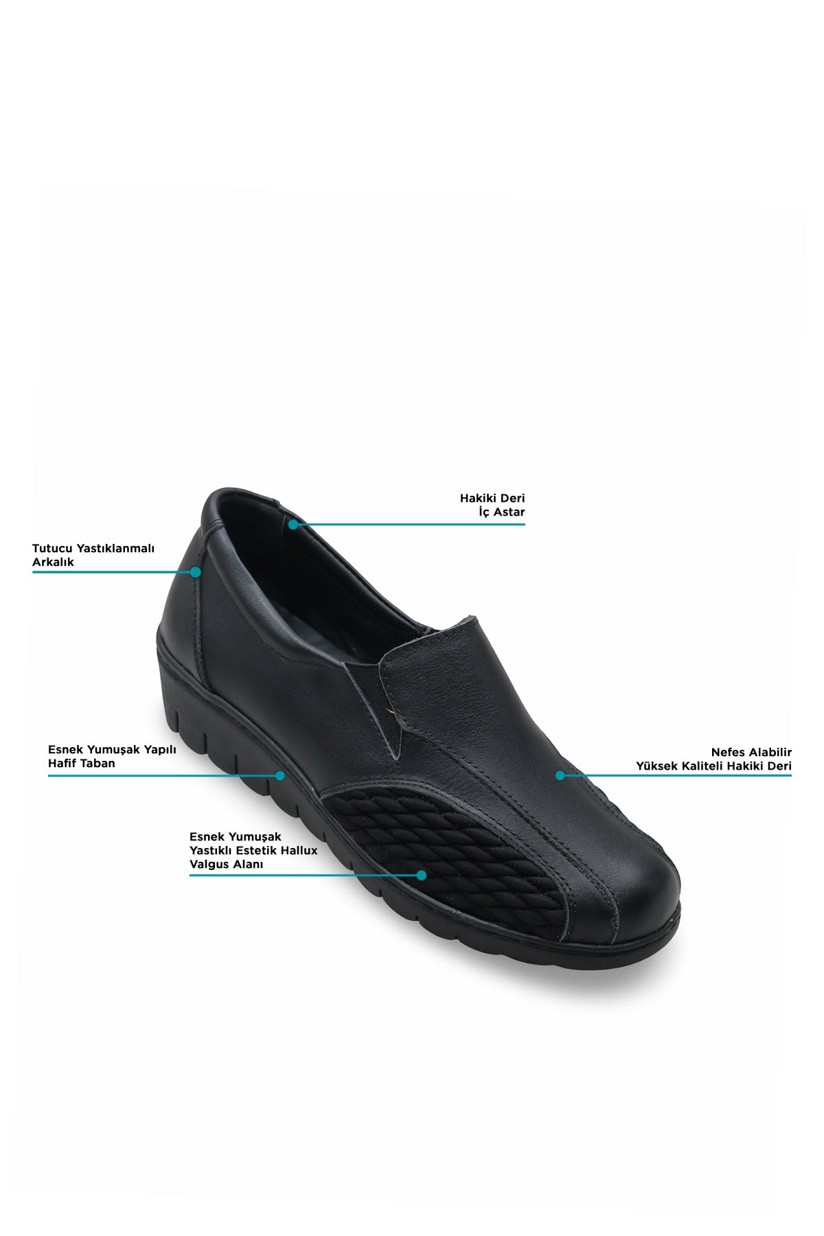 Halluks valgus (başparmak kemik çıkıntısı) olan ayaklar için tasarlanmış, yanlarda esnek yastıklamalı paneli ve geniş burunlu formu ile baskıyı azaltmayı hedefleyen konfor ayakkabısı. Hafif taban, yumuşak hakiki deri astar ve günlük hayata uyumlu tasarım bir aradadır.